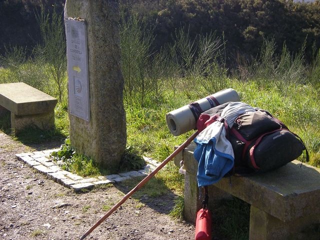 Un descanso en el Camino; sobre un banco, la mochila, el bordón y la cantimplora.