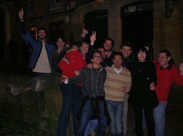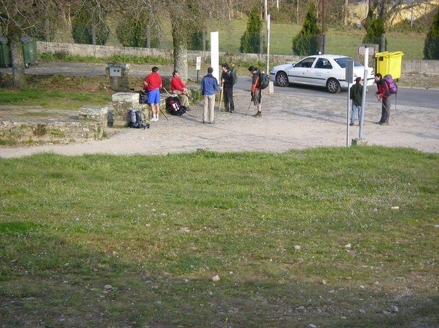 Al llegar allí me vio la dueña del establecimiento, quien me reconoció rápidamente y me dijo: “otra vez por aquí; si que llegas pronto, son sólo las 7 horas aún no habrán colocado la Catedral en la Plaza del Obradoiro”, comentó en tono de broma. Allí mismo ya había uno de los peregrinos, que prosiguieron el día anterior; se asombraron de que llegara tan pronto, pues ellos se acaban de levantar. Éramos nueve peregrinos, dos de Barcelona (los que había conocido unos día antes en el Bar de Morgade, poco después de Sarria) y seis de Madrid, yo era el noveno. Después de desayunar salimos todos con la idea de llegar juntos a Santiago; a uno le dolía el pie, pero podía seguir perfectamente.