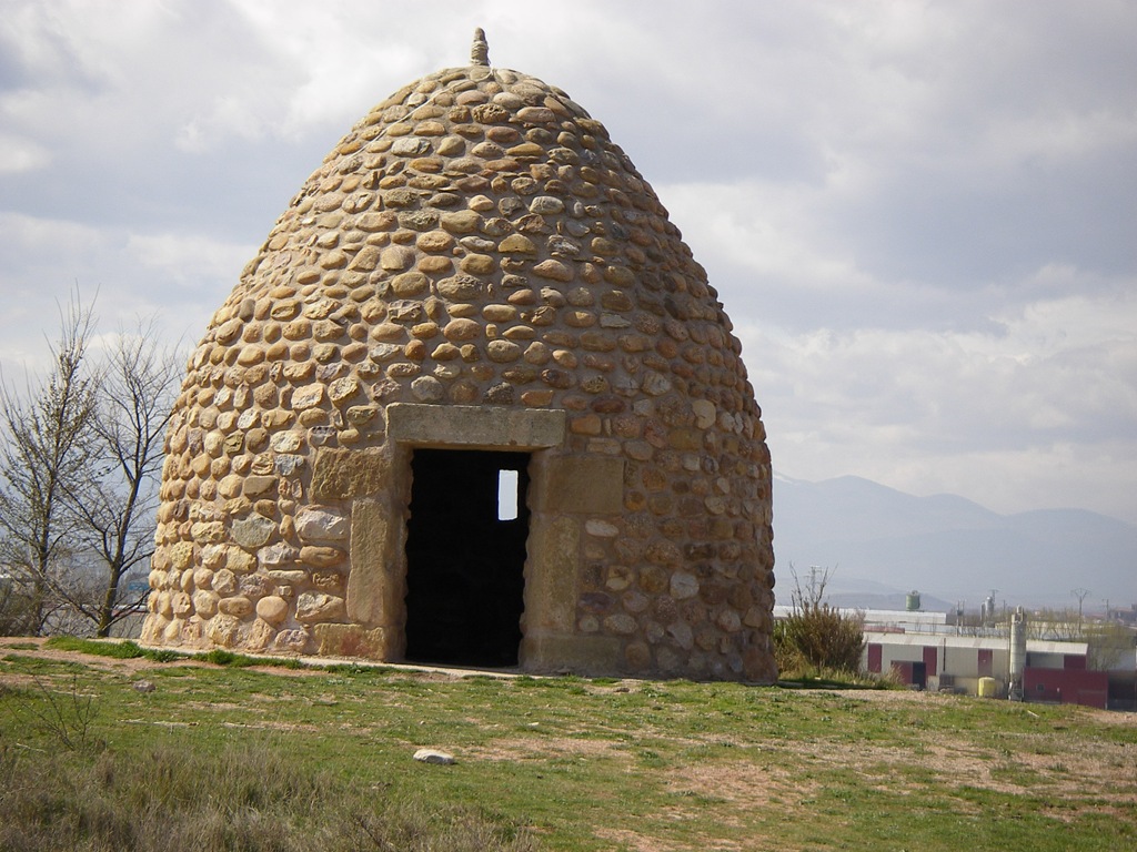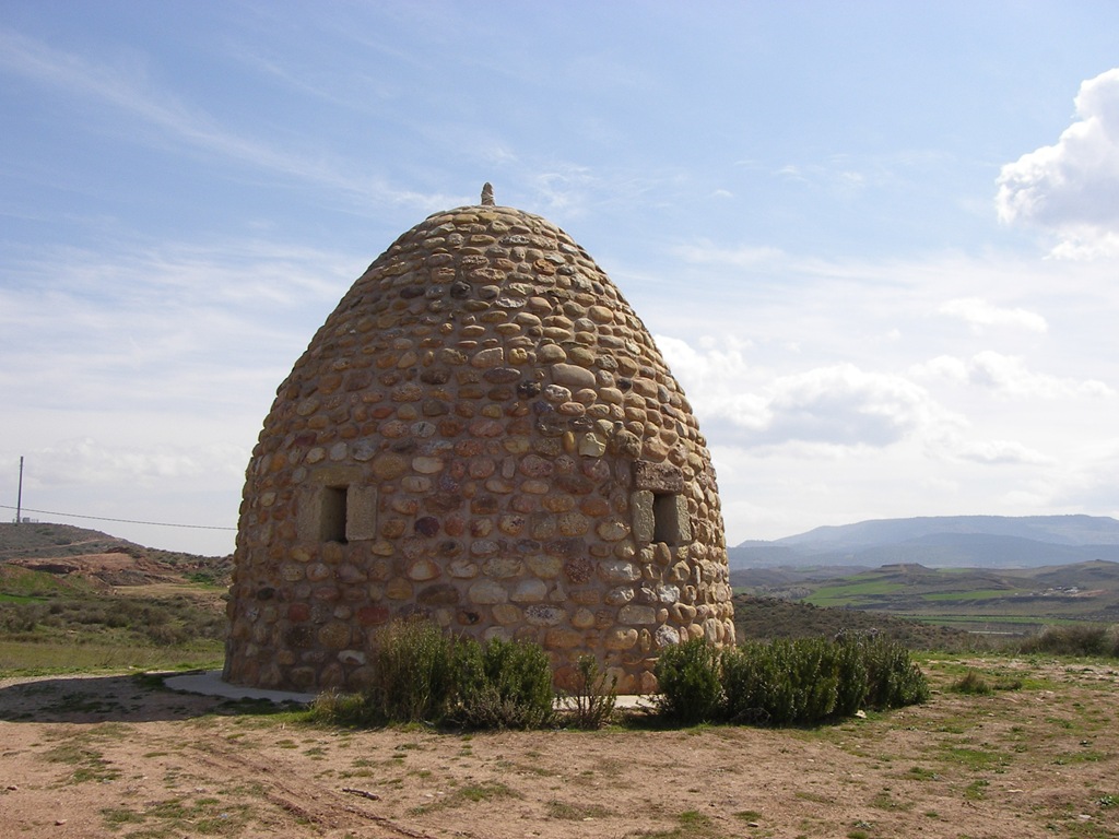 Realmente no son chozas. Es un monumento, el mismo por los dos lados, dedicado a una Leyenda entre un Gigante y Roldán en las proximidades o entrada de Nájera. En dicho lugar hay un pequeño monticulo con ese monumento y una dedicatoria. No sé el significado que tienen, pero sí es cierto que en las Montañas que se aprecian en esa ciudad hay unas cuevas, donde se refugiaban su habitantes en épocas antiguas o de guerra.
