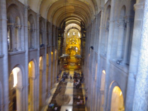 Antes de subir al tejado de la Catedral de Santiago pasas por la planta de arriba, situada sobre dl Pórtico de la Gloria. Desde allí tienes estas vistas del interior de la Catedral